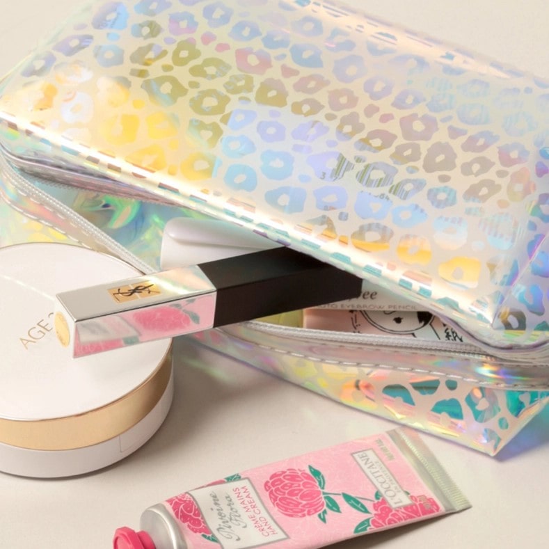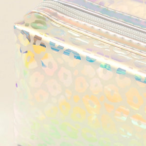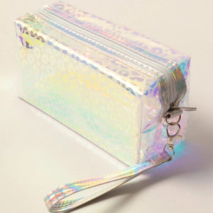 Leopard print pouch bag with zipper closure and detachable wrist strap. 100% PVC.
